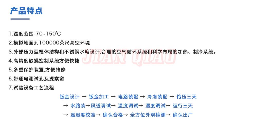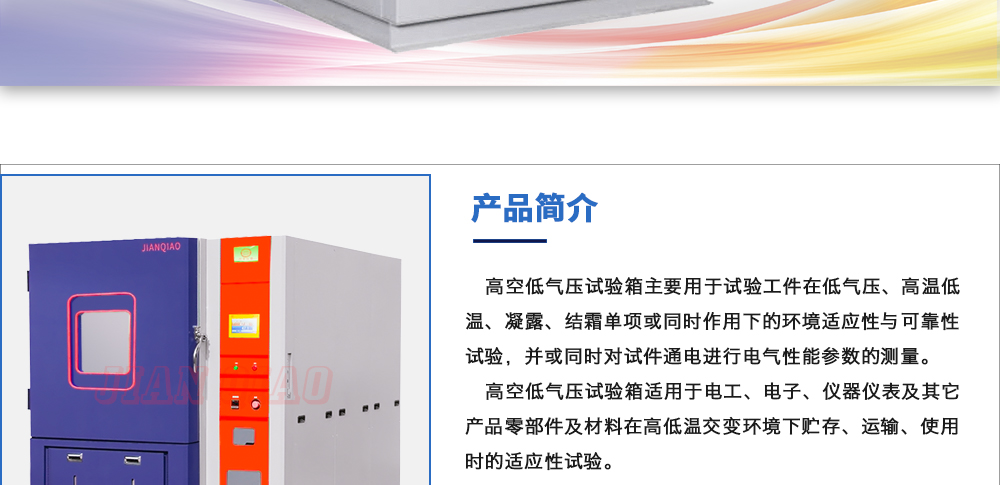 用途:高低溫低氣壓試驗(yàn)箱主要用于試驗(yàn)工件在低氣壓、高溫低溫單項(xiàng)或同時(shí)作用下的環(huán)境適應(yīng)性與可靠性試驗(yàn),并或同時(shí)對試件通電進(jìn)行電氣性能參數(shù)的測量。