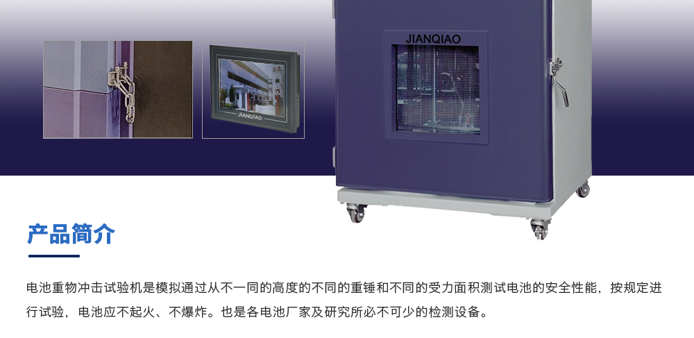 用途:電池重物沖擊試驗機是模擬通過從不一同的高度的不同的重錘和不同的受力面積測試電池的安全性能,按規定進行試驗,電池應不起火、不爆炸。也是各電池廠家及研究所必不可少的檢
