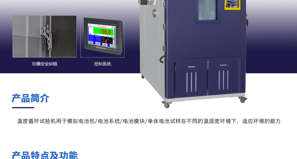 用途:溫度循環(huán)試驗(yàn)機(jī)用于模擬電池包/電池系統(tǒng)/電池模塊/單體電池試樣在不同的溫濕度環(huán)境下,適應(yīng)環(huán)境的能力