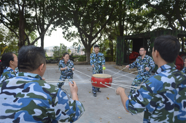 第三個項目:鼓動人心。一只大鼓周邊系滿了繩子,兩組隊員,每人一組十人合力拉緊繩子把鼓拉起,在鼓上放一只網球,利用鼓的彈性將網球彈起高于5cm的距離,一分鐘內哪組彈起的次數多者獲勝。比賽時所有人員的都全神貫注于網球的起落和全力控制鼓的移動及上下,項目對于團隊溝通協作起到了很好的啟示作用。
