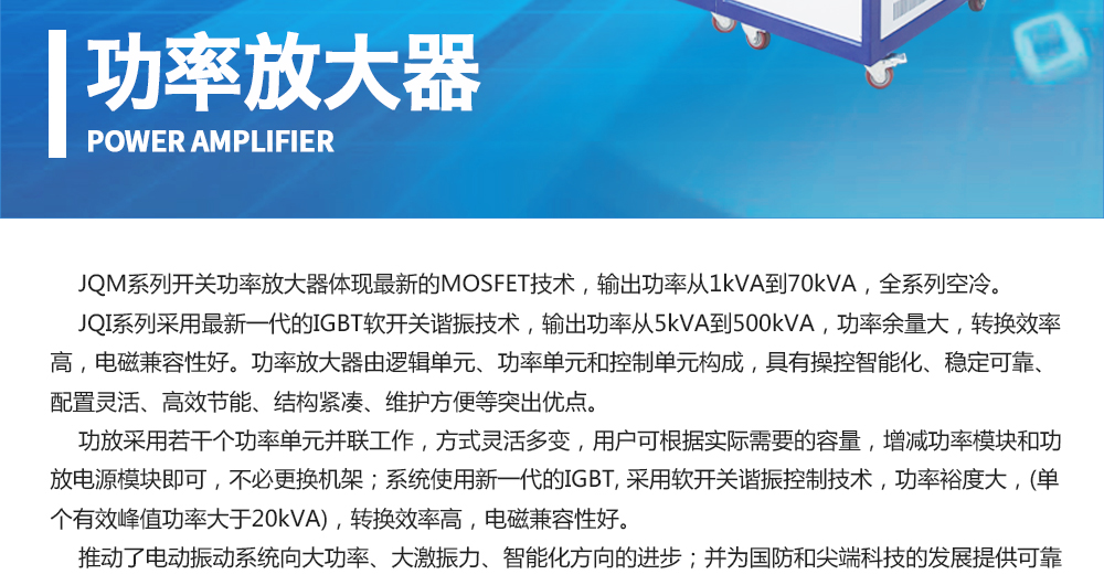 用途:功率放大器由邏輯單元、功率單元和控制單元構(gòu)成,具有操控智能化、穩(wěn)定可靠、配置靈活、高效節(jié)能、結(jié)構(gòu)緊湊、維護(hù)方便等突出優(yōu)點。